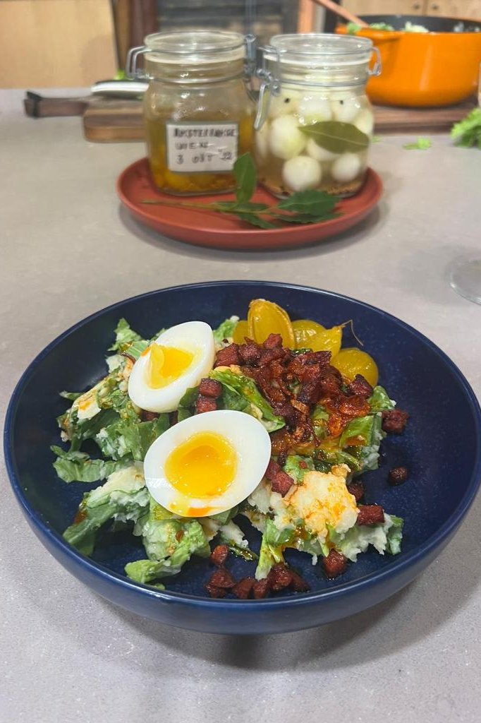 Stap 9: Verdeel de stamp over de borden en maak af met het chorizokruim en de sjalot. Halveer de eieren en leg deze op het gerecht.