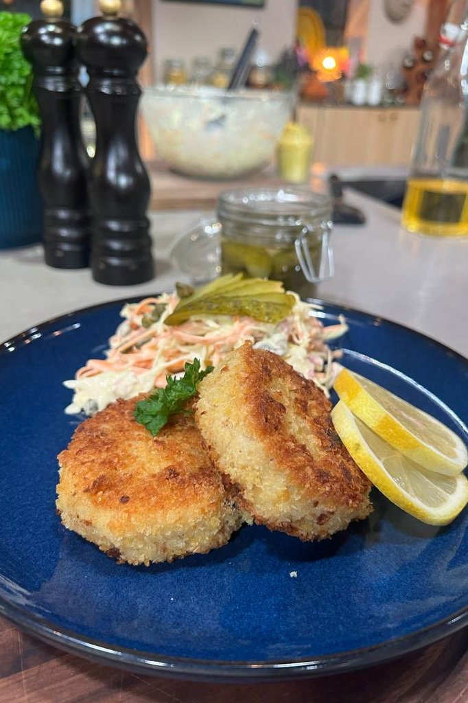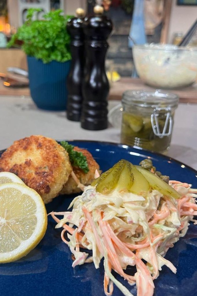 Hugo’s menu bestaat uit twee onderdelen. We beginnen met de Engelse viskoekjes en verderop vind je het recept voor de frisse koolsla met winterpeen.