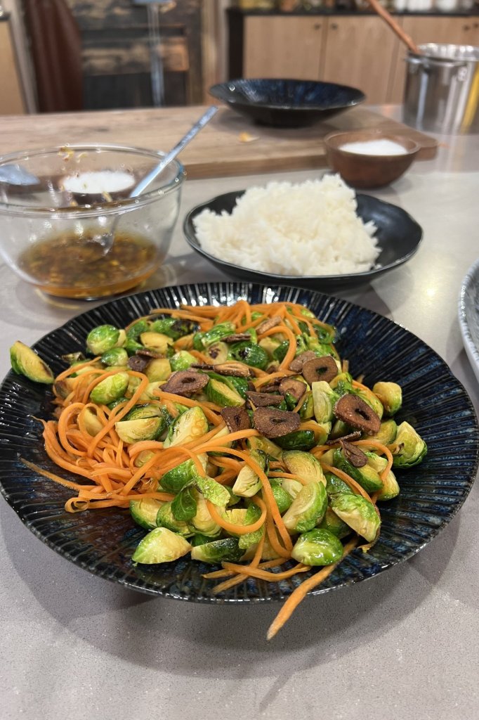 Gebakken spruiten en peen met crispy knoflook