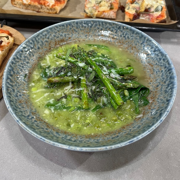 Lentegroentesoep met aspergetips & makkelijke pizzabroodjes