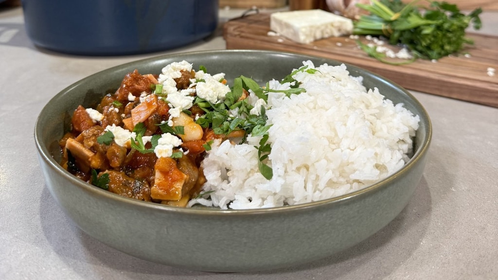 Stap 11: Schep het gerecht op de borden. Verkruimel de feta erover en bestrooi met peterselie.