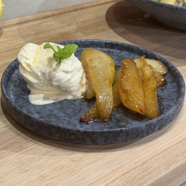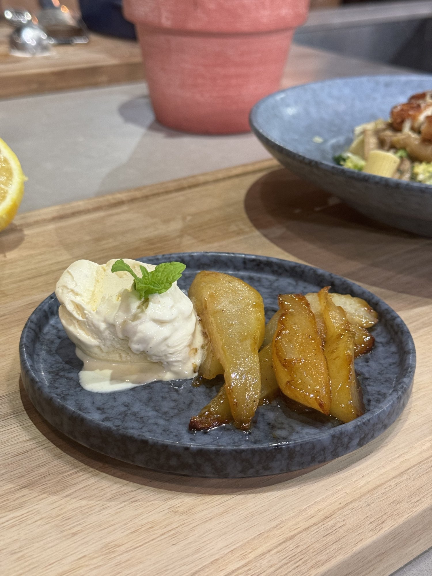 Stap 4: Doe de gekaramelliseerde peren op bordjes en schep er een bol ijs op. Garneer met wat muntblaadjes.