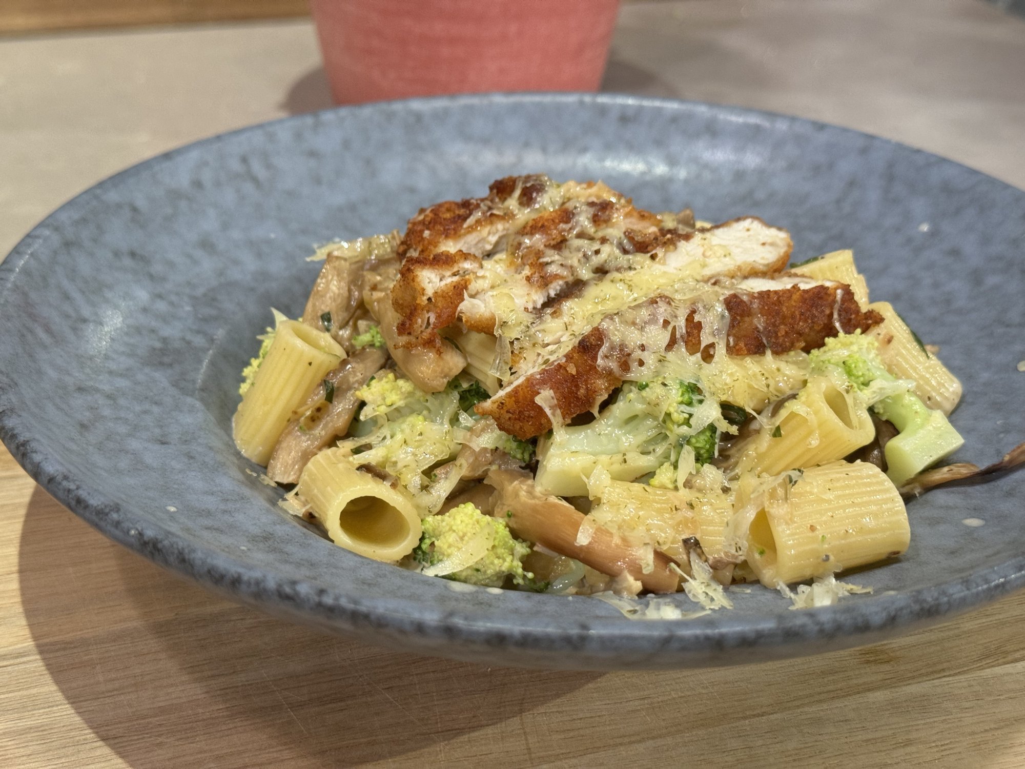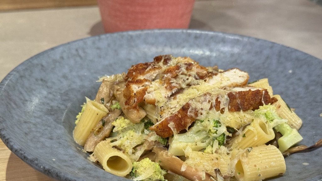 Pasta met oesterzwam, broccoli en krokante kipschnitzel & gekarameliseerde peer met vanille-ijs