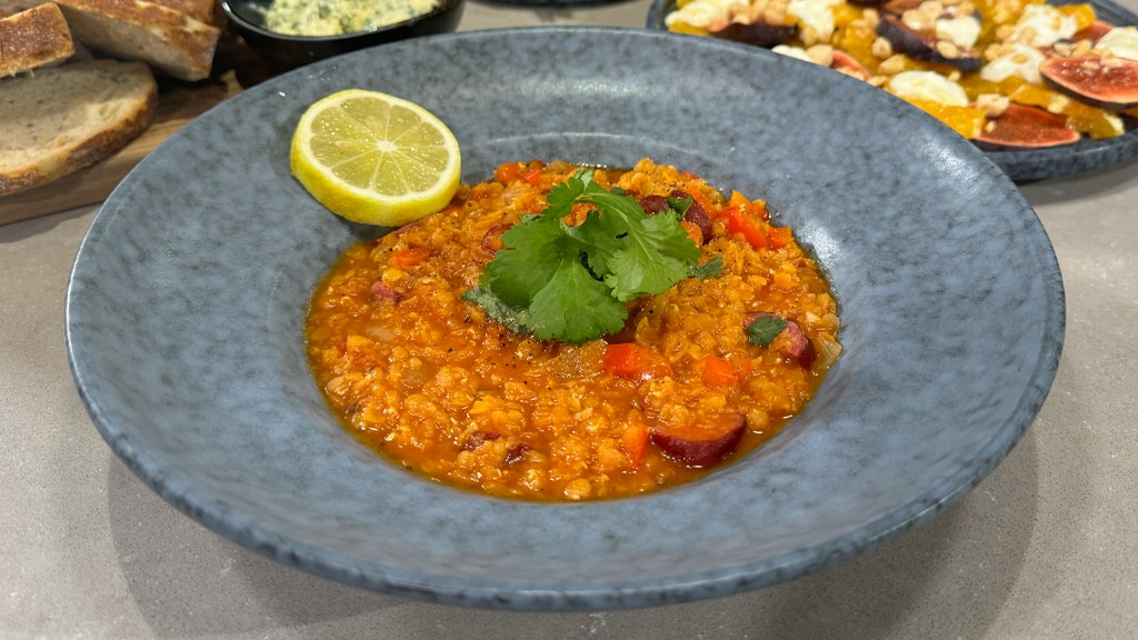 Linzensoep met rookworst en korianderboter en een sinaasappel-vijgensalade
