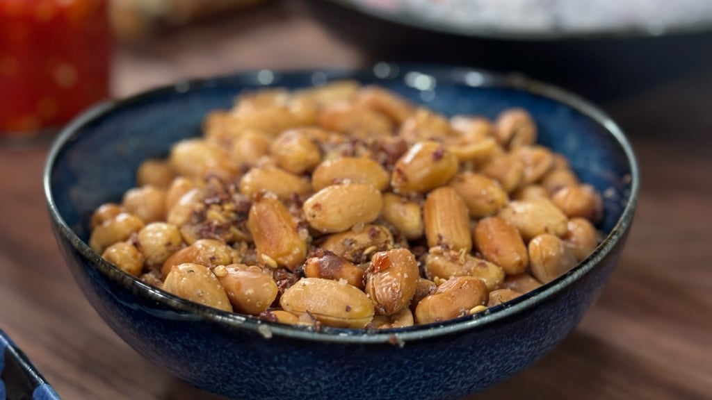 Als eerste vind je de bereidingswijze van de garnalentoast, vervolgens het recept voor de gefrituurde zout- en peperinktvis en tot slot de bereiding van de szechuanpinda’s.