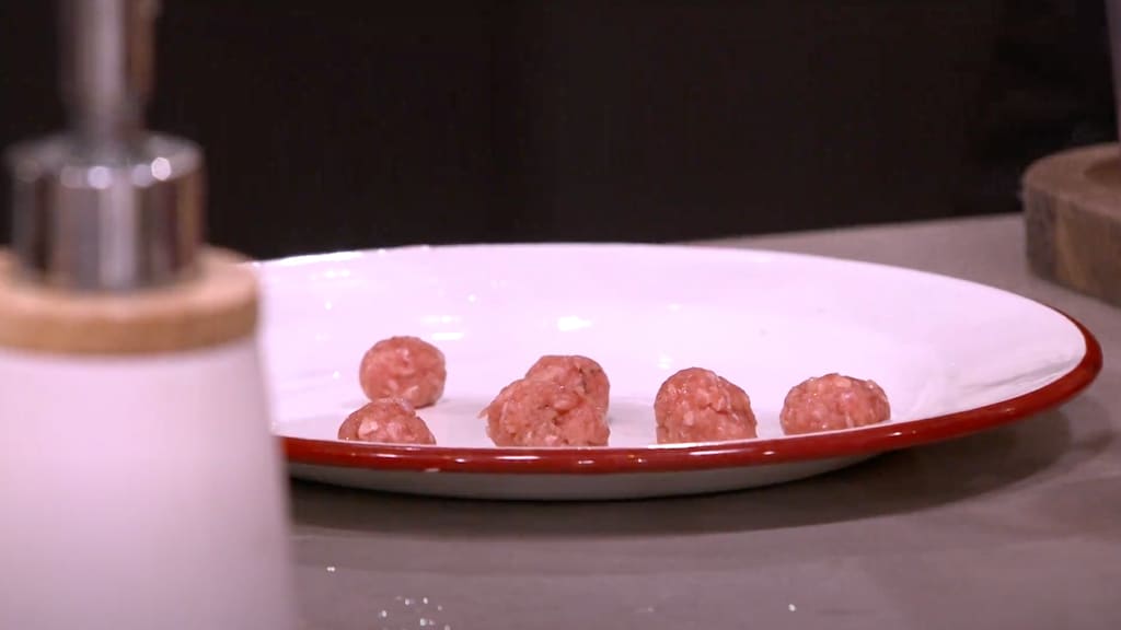 Stap 5: Meng het gehakt met het paneermeel en het ei. Breng het mengsel weer op smaak met peper en zout. Rol er daarna kleine balletjes van.