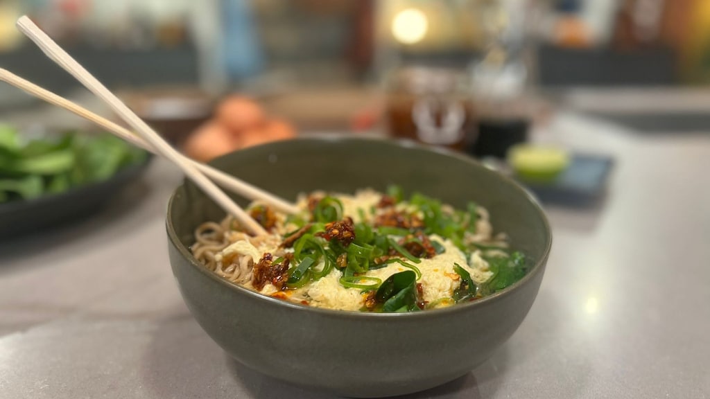 Vandaag maakt Hugo een heerlijke snelle maaltijdsoep met noedels, spinazie en eieren. Deze soep wordt ook wel 'egg drop noodle soup' genoemd. De eieren worden op het einde gedropt in de soep, zodat er heerlijke slierten ontstaan. Om de noedelsoep meer pit te geven maakt Hugo ook crispy chili-olie erbij. Haal alle ingrediënten in huis en ga aan de slag!