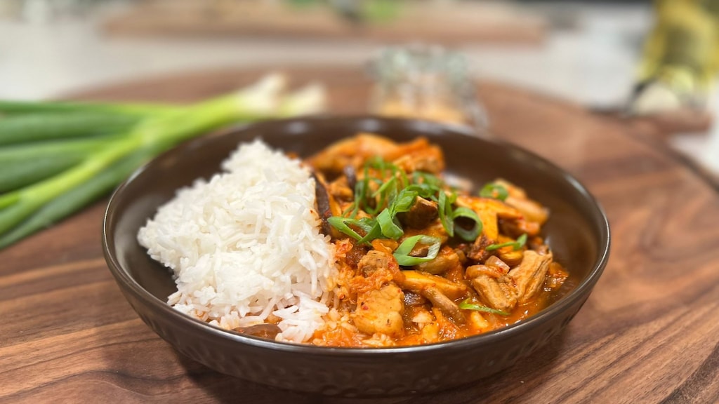 Heerlijke Koreaanse stoof met kimchi en een frisse komkommersalade