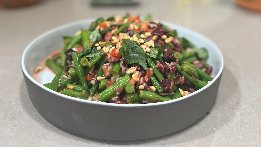 Stap 6: Schep de bonen door het mengsel en bestrooi de salade met de pijnboompitten.