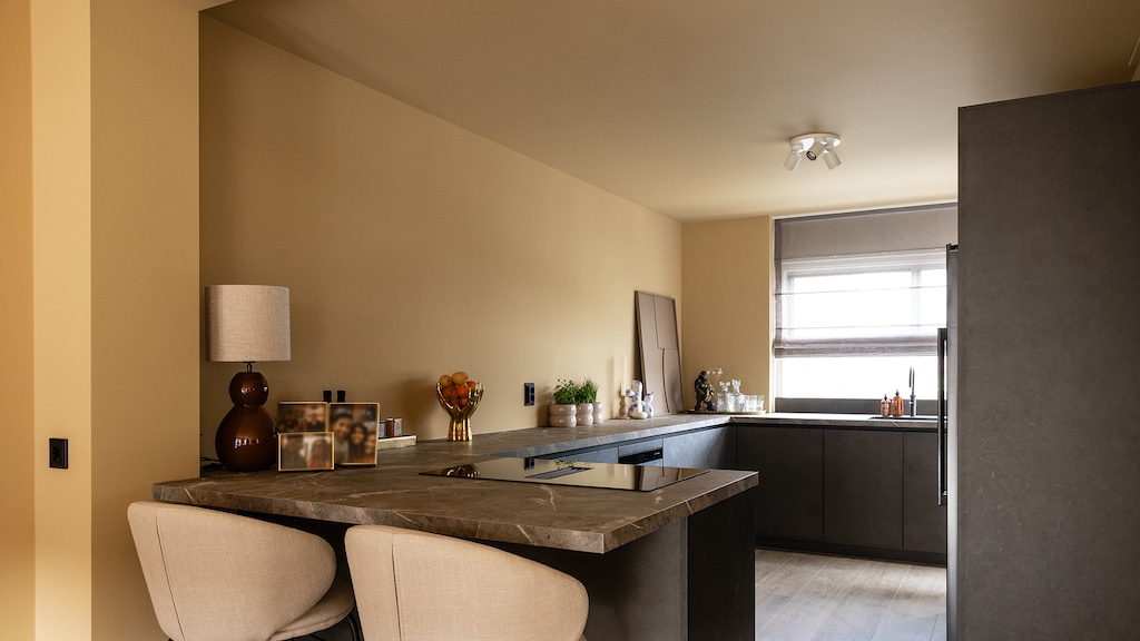 Een van de wensen van het stel voor de woonkamer, was een eettafel waar ze z'n zevenen aan konden zitten. Ook dat is gelukt! Sterker nog: er is plek voor tien man. Ook op de prachtige, grote bank kan het hele gezin gezellig televisie kijken.