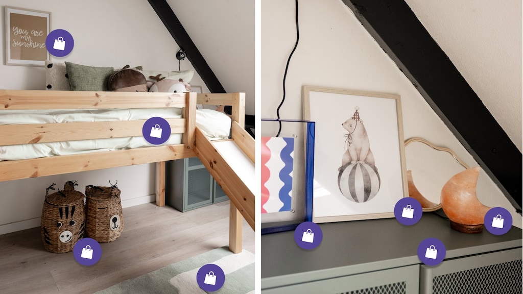 Nachtkasjes en vloerkleed zijn gekocht in de kringloop.