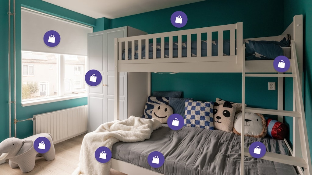 In eigendom van Joost en Cleo: vloerkleed | speelgoedkasten | grote kast | knuffels | opbergbankje | prikbord