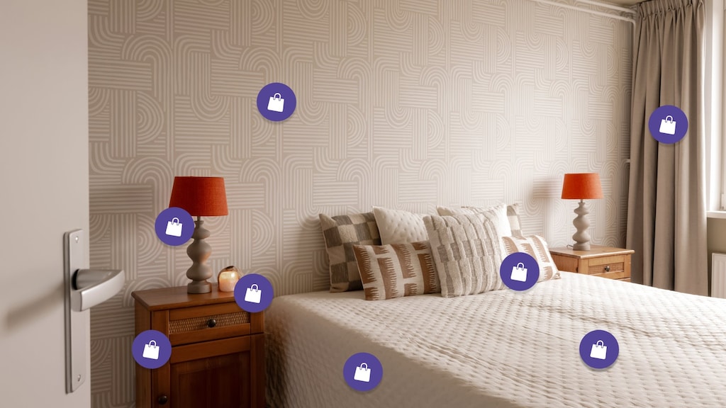 Behang | nachtkastje | nachtlampje | bedsprei | sierkussens | sierkussens | poefjes | bijzettafel
