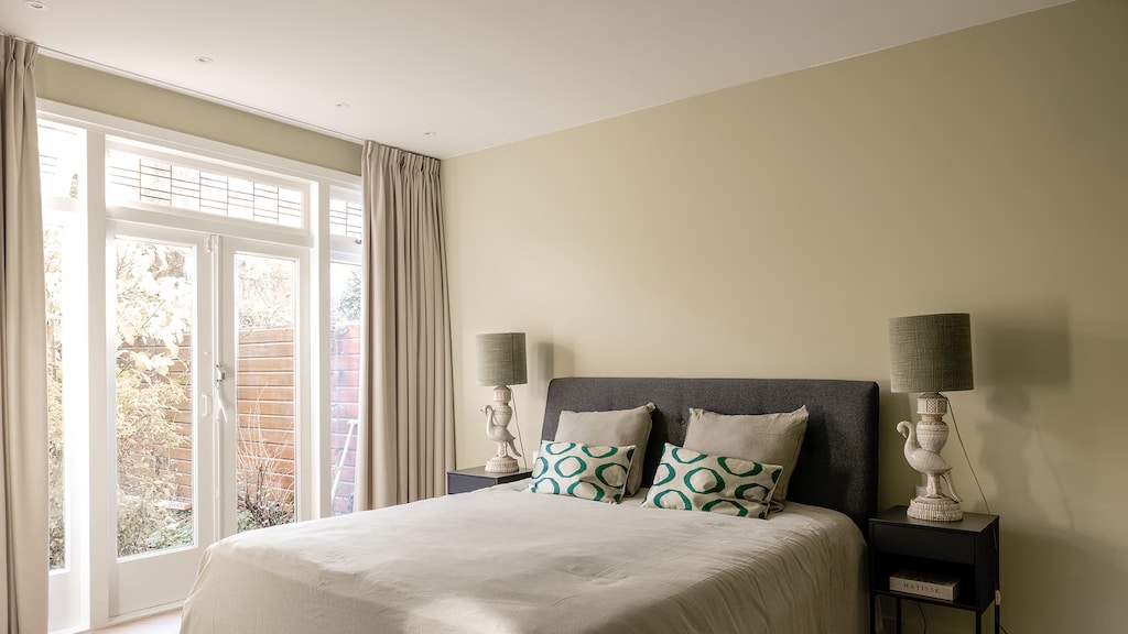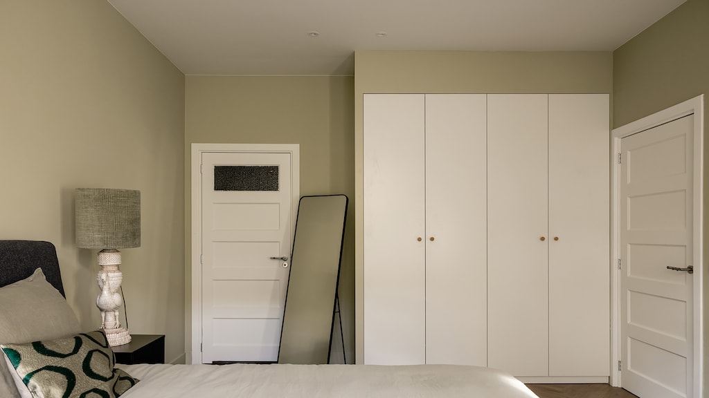Zo is ze ook in de slaapkamer van Arnoud en Patricia te werk gegaan. Daar zijn de nachtlampen gerecycled. Door er nieuwe kappen op te zetten passen ze weer helemaal in het geheel. Er is gekozen om te werken met een groentint op de muren, en om voor rust te zorgen, zijn ook de plinten in deze tint geschilderd.