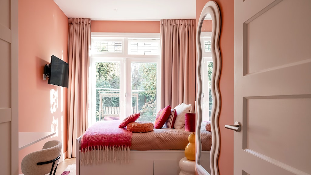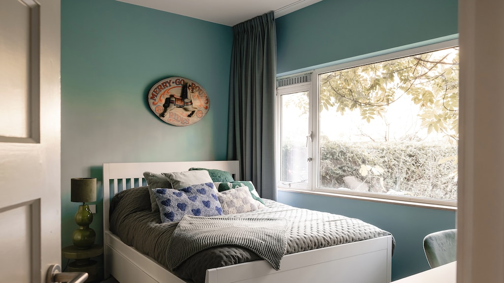 Dan de tweede slaapkamer; vergelijkbaar, maar toch heel anders, zo zeggen Arnoud en Patricia als ze hem zien. Er is ruimte voor een bureautje, een groot bed én mooie gordijnen - precies wat je als tiener nodig hebt. De laatste slaapkamer is qua sfeer anders; daar is gewerkt met blauw en groen en is ook ruimte om huiswerk te maken. Ook daarvan weten de ouders zeker dat dochterlief er wild van is.