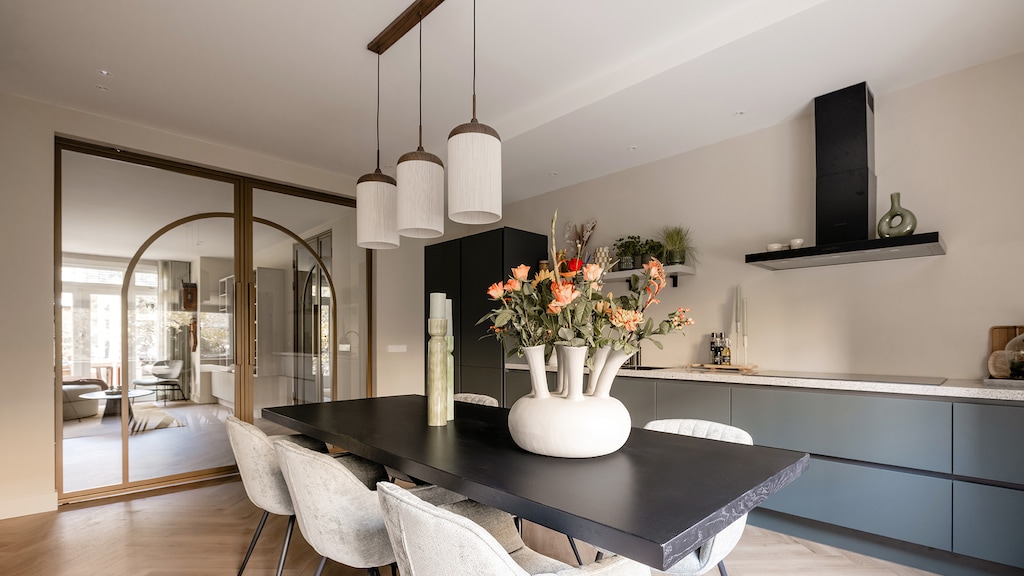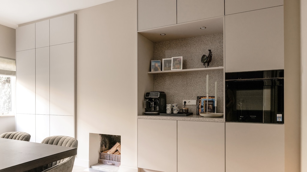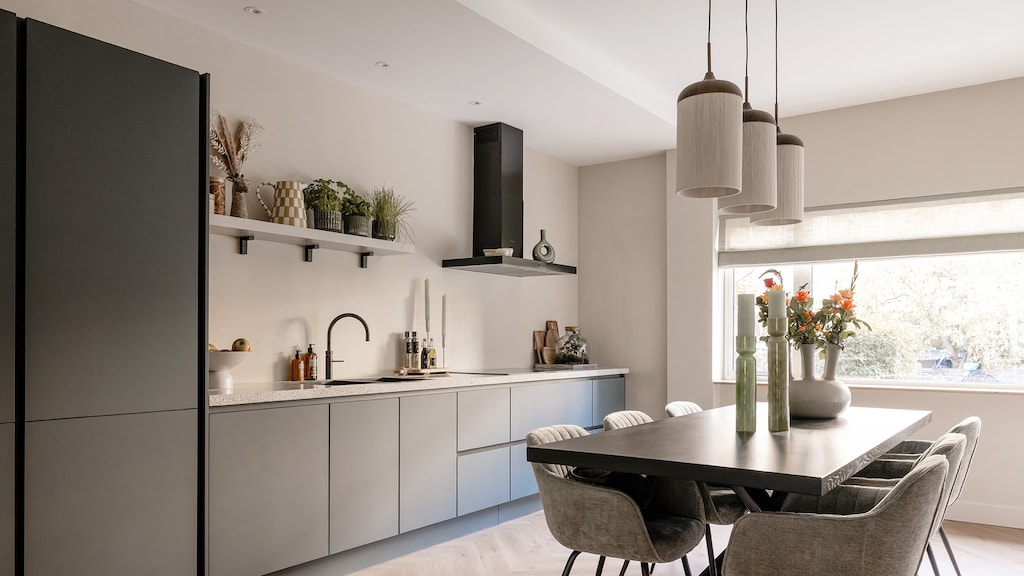 Beneden gaat ook alles op de schop. De keuken, die het stel zelf uitkiest, gaat naar de andere kant van de woonkamer, waardoor er echt een brede leefkeuken ontstaat met ruimte voor een grote tafel en fijne stoelen voor het hele gezin. De keuken is afgesloten door speciaal voor hen ontworpen deuren, waardoor er een kamer en suite ontstaat. De open haard is op z'n plek gebleven, maar een stuk strakker gemaakt en op deze manier helemaal onderdeel van de fijne woonkeuken.