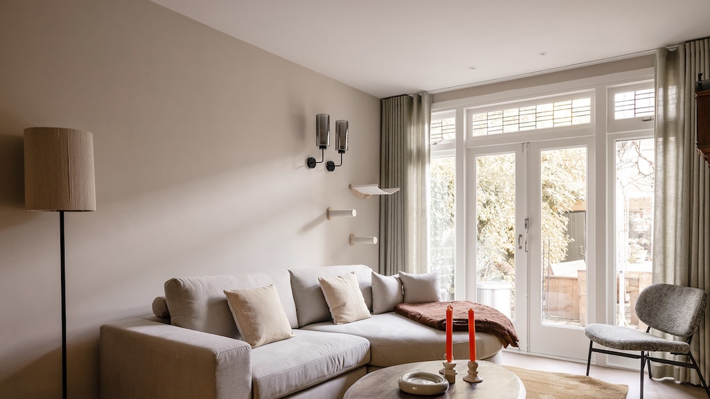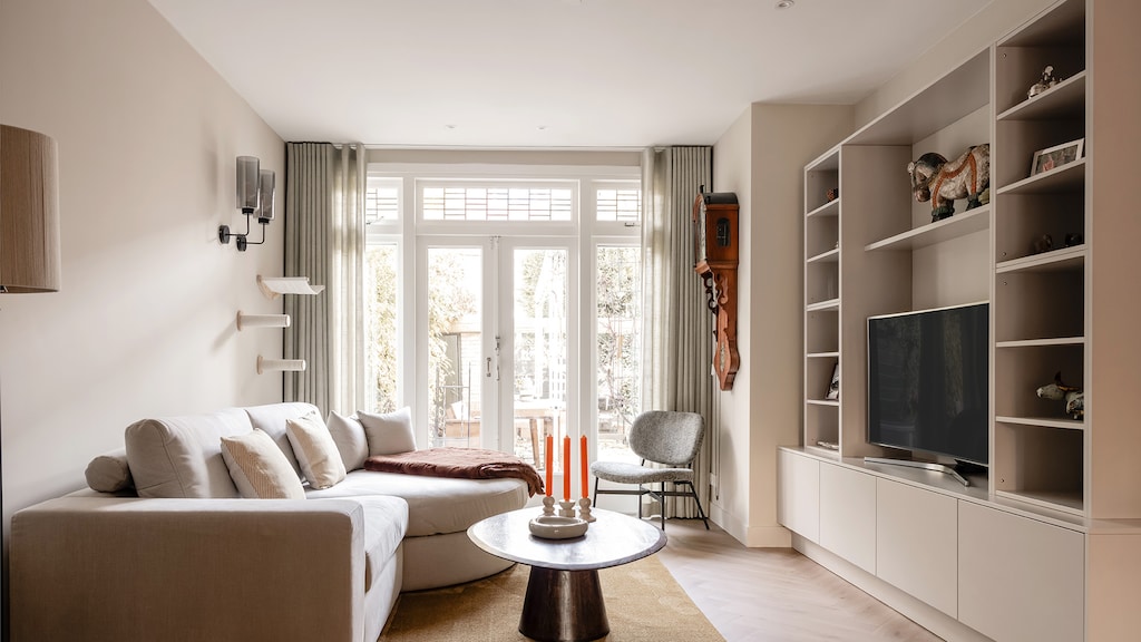 Aan de voorkant van het huis is een mooie bank geplaatst in de zithoek, die ruimte biedt aan het hele gezin. De salontafel weerspiegelt de sfeer van het chique herenhuis. Ook is er een prachtige op maat gemaakte kast voor de tv neergezet én staat hun eigen piano er weer. Dat was het doel van Jolijn: oud en nieuw samen laten komen.