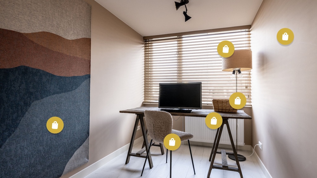 Wandkleed | bureaustoel | raambekleding | houten bureau | rieten mandje