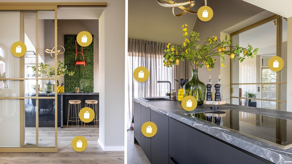 Keukeneiland | stalen schuifpui met zijpaneel goud | nieuwe kozijnen | gordijnen kleur rock | hanglamp goud | vaas met citroenen - Des Pots