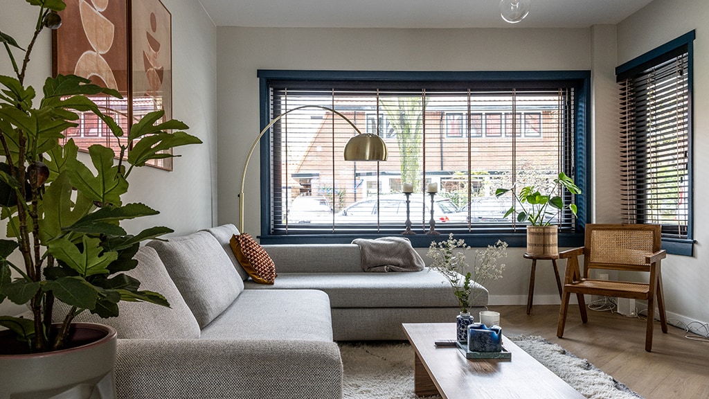 In de woonkamer staat een grote hoekbank in een zachte tint. Zo past hij mooi bij de rest van de ruimte.
