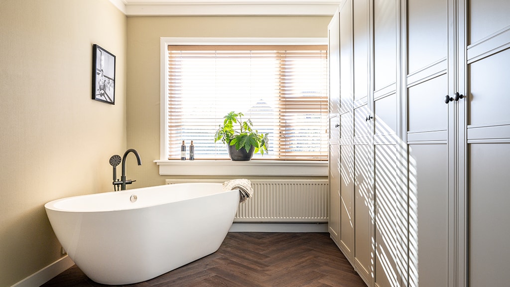 Maar het houdt nog niet op voor Michiel. Hij kan eindelijk zijn bed in zonder te bukken én “ik wilde altijd al naast het raam liggen en nu kan dat gewoon”, zegt Michiel. En dan heeft hij nog niet eens de grootste verrassing gezien: het vrijstaande bad in de aangrenzende kamer. Natuurlijk is er ook aan de wensen van Bonne gedacht. “Heb jij toch je vissengraat vloer”, zegt Michiel tegen Bonne.