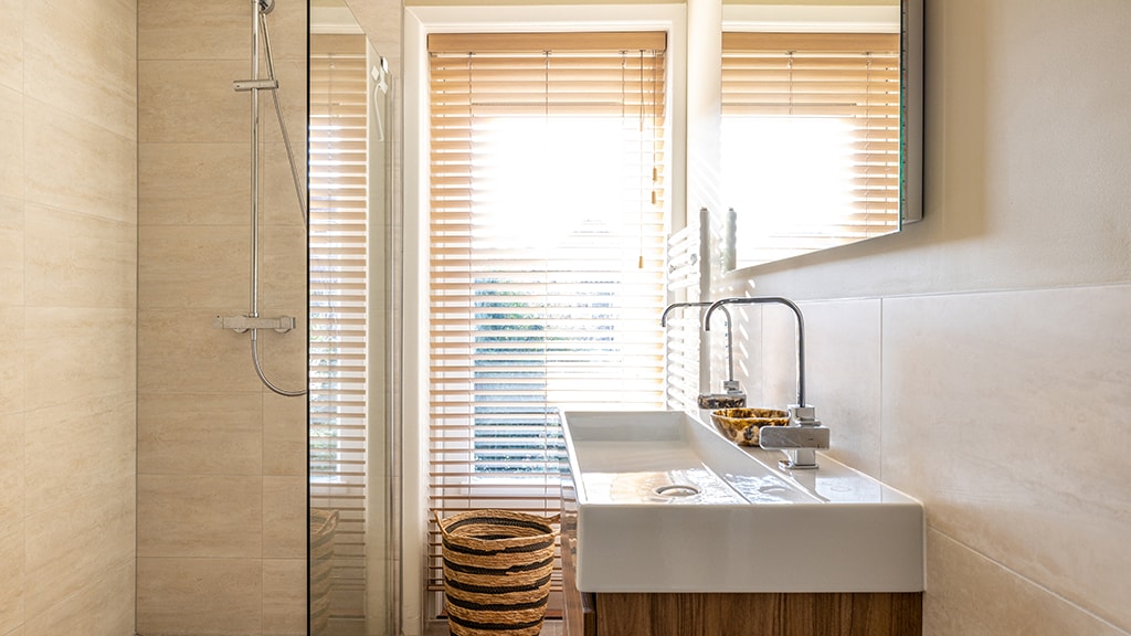 Een rustige badkamer met prachtige beige tinten en chroomkleurige kranen. Het is ruim opgesteld, doordat het bad op een andere plek zit. Die is namelijk verhuisd naar de slaapkamer.