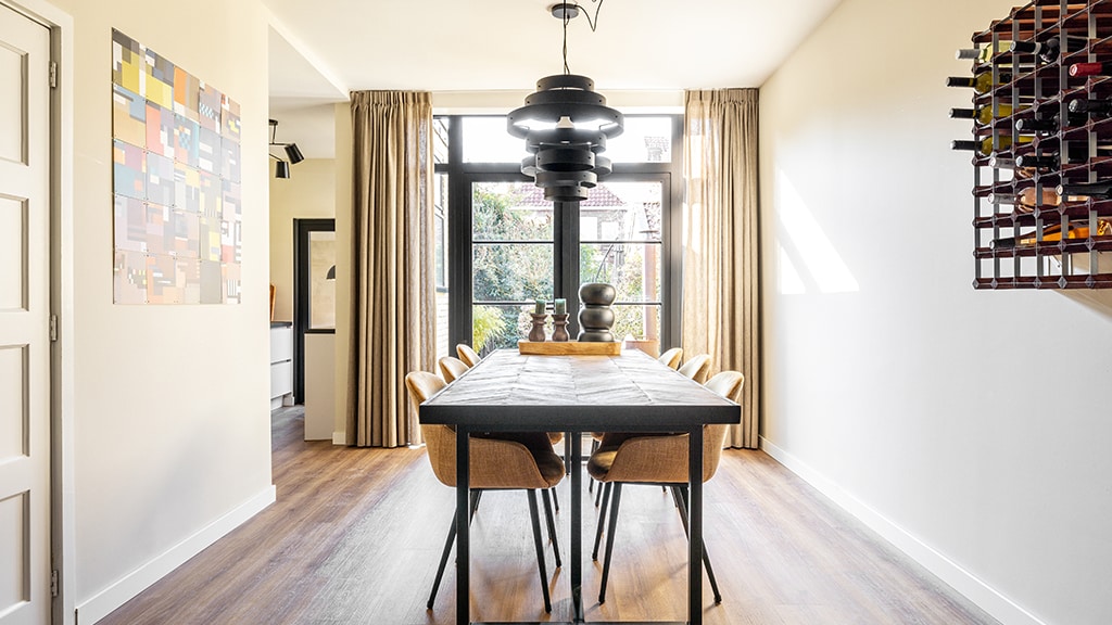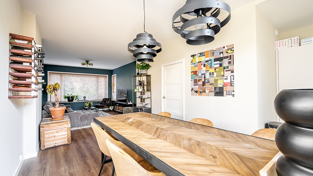 Toch is de grote eethoek deels verbonden met de keuken, zodat je alsnog dat open gevoel ervaart. Ook de houten vloer is geen visgraat geworden zoals de wens eigenlijk was, want Roos had hiervoor wat anders bedacht. Namelijk een grote eettafel waar een visgraatblad op zit! Met daaromheen comfortabele eetkamerstoelen.
