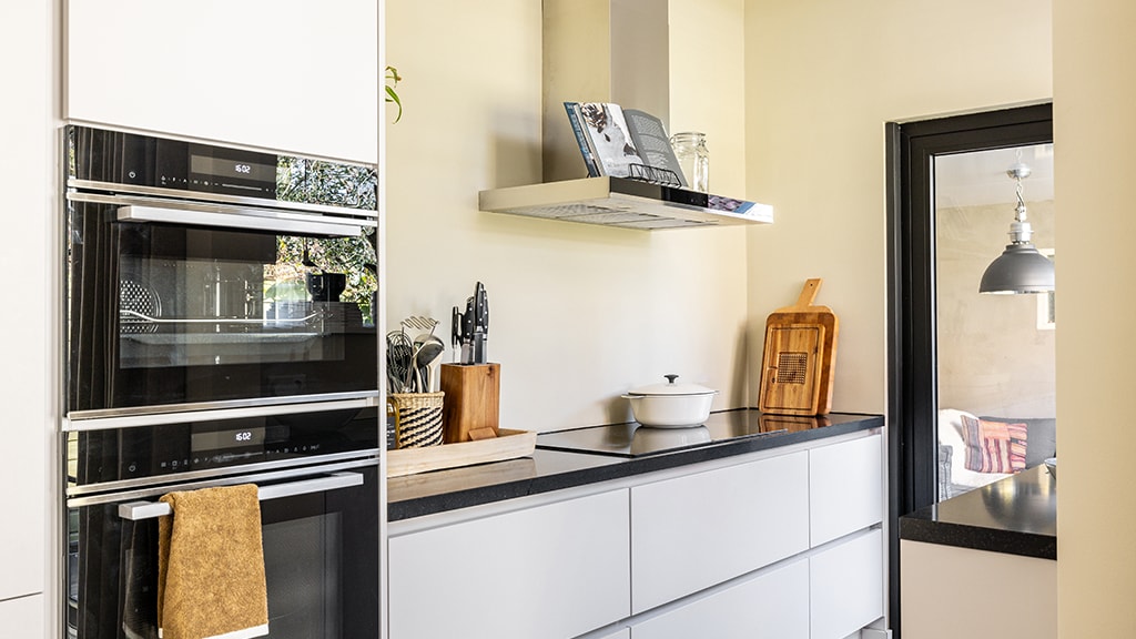 Om de strakke keuken te maken heeft Roos gekozen voor een zwart keukenblad van graniet met daaronder grote witte lades zonder greepjes. Er is veel opberg- en werkruimte, alleen niet de open keuken die ze zo graag wilden.