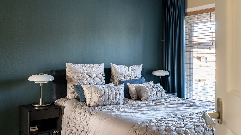 De slaapkamer zelf heeft dezelfde groene uitstraling als de woon- en werkkamer. Dit in combinatie met de rustige beige tinten zorgt ervoor dat deze kamer wederom een luxe, maar toch huiselijke sfeer krijgt. De donkerbruine visgraatvloer maakt deze look helemaal compleet.