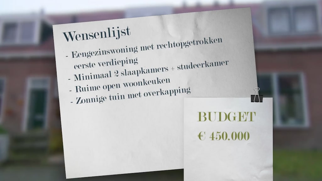 Bonne en Michiel hadden aan het begin van de zoektocht een kans om al hun wensen door te geven aan Alex, Bob en Roos. Het stel wilde graag een eengezinswoning met een rechtopgetrokken eerste verdieping (geen schuine plafonds dus), minimaal twee slaapkamers, studeerkamer, ruime open woonkeuken en een zonnige tuin met overkapping. En dit alles in de westkant van de stad Leeuwarden.