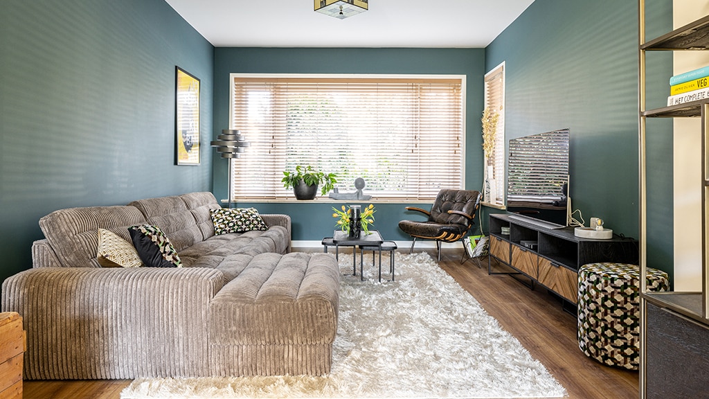 De woonkamer is afgebakend door de muren in dit gebied groen te verven. De grijze hoekbank geeft deze kamer een huiselijke en knusse sfeer. Dit in combinatie met alle andere grijze en gouden items zorgt ervoor dat het een sfeervol geheel is.