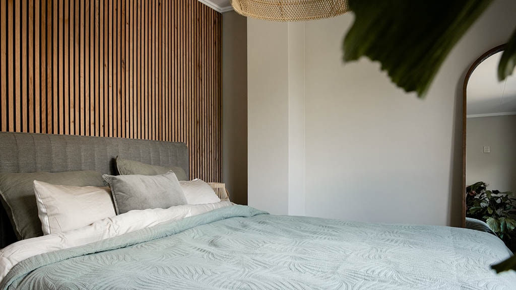 bed | nachtkastjes | gordijnen | vloerbedekking | wandpanelen | hanglamp | plinten | spiegel