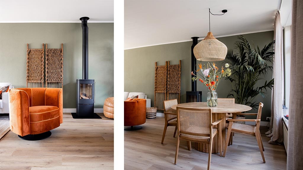 In de woonkamer staat een comfortabele en opvallende oranje fauteuil. Een item dat goed uitkomt naast de grote lichtgrijze bank. Roos koos in het eetgedeelte voor een ronde tafel met stoelen, voorzien van webbing rugleuning voor de Indonesische sfeer. Met de de juiste accessoires en planten krijgt de kamer een warme en huiselijke sfeer.
