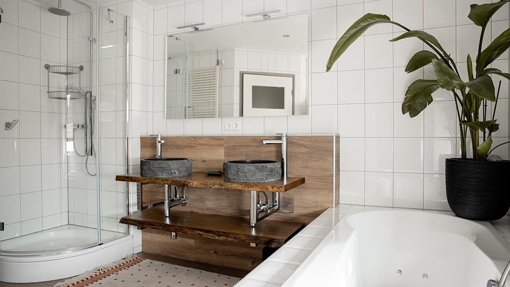 Er was geen budget meer over om de badkamer een volledige opknapbeurt te geven, maar er was wel ruimte voor een frisse upgrade. Bob heeft ervoor gekozen de witte tegels erin te laten, maar de vloer wel te vervangen. Daarnaast is er een mooi badkamermeubel met twee waskommen met hamerslag look geplaatst, zodat het stel tegelijk in de badkamer bezig kan zijn. Aan ruimte namelijk geen gebrek in deze kamer in het huis.