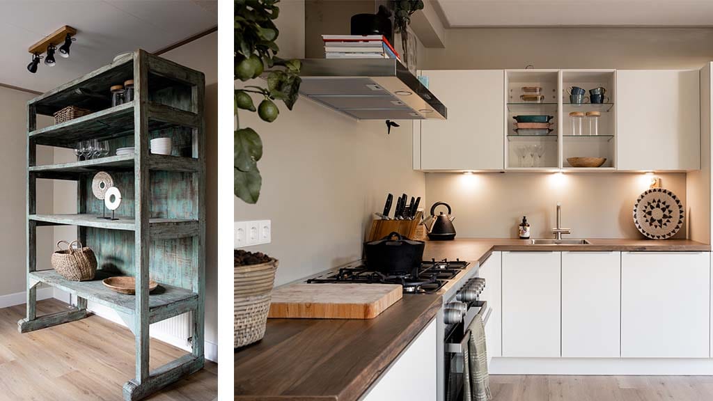 Roos gaat aan de slag met het interieur en heeft de moodboards van het stel uitvoerig bekeken. Zowel Riski als Lisa zijn een beetje basic in het kleurgebruik, dus daar wordt goed naar geluisterd. En omdat de twee elkaar hebben leren kennen in Indonesië voegt Roos dit thema op subtiele wijze toe in de woning. Ze houdt de basiskleuren rustig met beige en groen en in de keuken kiest zij voor wit en hout voor de kasten en het werkblad.