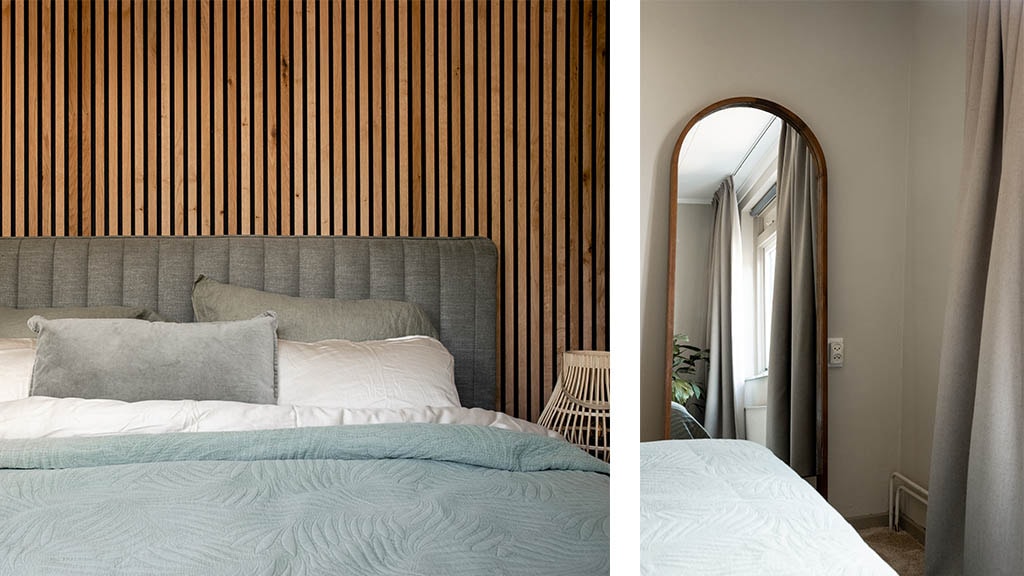 De wens van Lisa en Riski was een huis met drie slaapkamers. De ruime master bedroom heeft een moderne houten lattenwand en comfortabele boxspring. Speciaal voor Riski ligt er vloerbedekking in deze kamer, want dat vindt hij zo fijn.