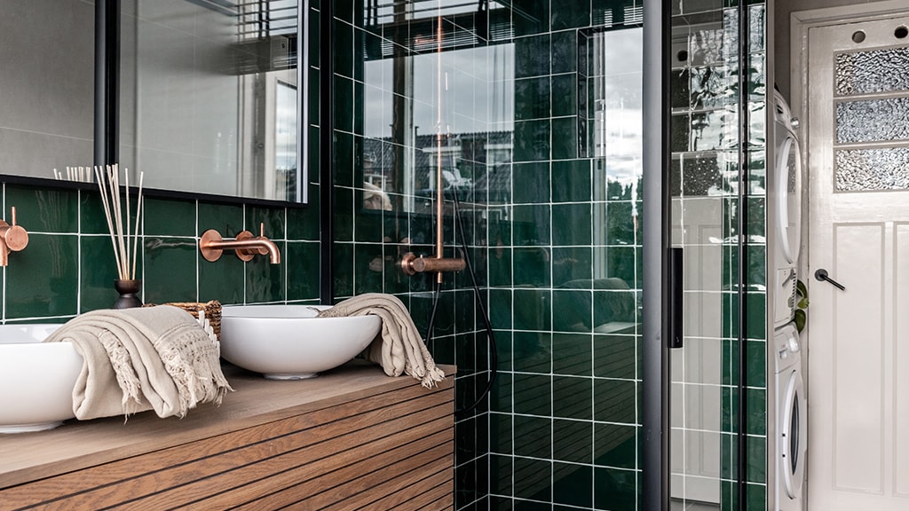 In de badkamer komt de kleur groen ook op een chique manier terug. De handgevormde tegels op de douchewand hebben een mooie donkergroene kleur, wat voor een extra klassieke uitstraling zorgt. Er is gekozen voor een luchtige, hangende badkamerkast met moderne waskommen. De kranen en de douche zijn van koper om de chique sfeer te accentueren.