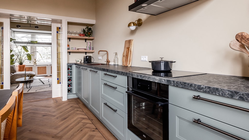 Nu de woning verbouwd wordt is het aan Roos de taak om het interieur helemaal naar wens van Ruben en Sanne in te richten. Het stel heeft moodboards waar veel klassieke elementen in terugkomen, waarbij ook de kleur groen veel terugkomt. Roos heeft er daarom voor gekozen om de keuken in een mooie donkere groene kleur te maken, met op de muren een lichte beige tint. En jawel! Zoals Roos het zegt, dit appartement leent zich écht voor een visgraatvloer, dus die komt er! De basis in de woonkamer en keuken krijgt een zachte en neutrale kleur en dat combineert Roos met mooie linnen vouwgordijnen.