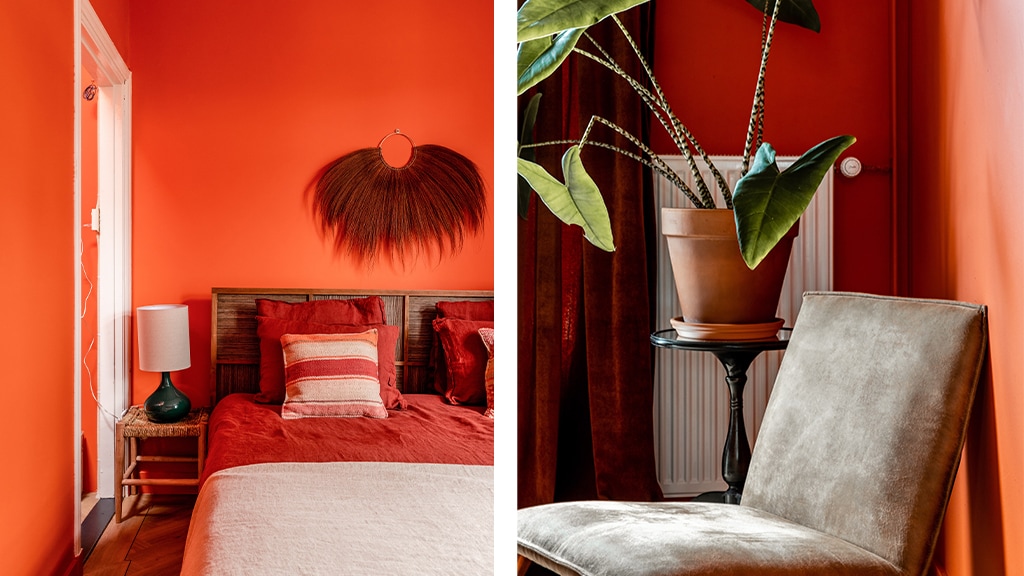 Op de moodboards van Ruben en Sanne stond een mooie roodoranje kleur. Roos heeft ervoor gekozen om de slaapkamer in deze gave kleur te laten schilderen. De kleur is een echte eye-catcher en geeft de ruimte meteen een fijne en uitgesproken sfeer. De accessoires en overige materialen geven de kamer een beetje een Balinese sfeer.