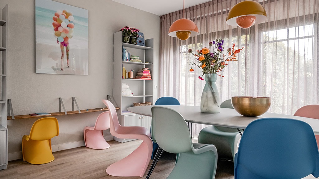 eettafel | eetkamerstoel roze | eetkamerstoel groen | eetkamerstoel blauw | hanglampen | kinderstoel geel | kinderstoel roze | wandplank | kunstwerk | jaloezieën | vloer | achterpui
