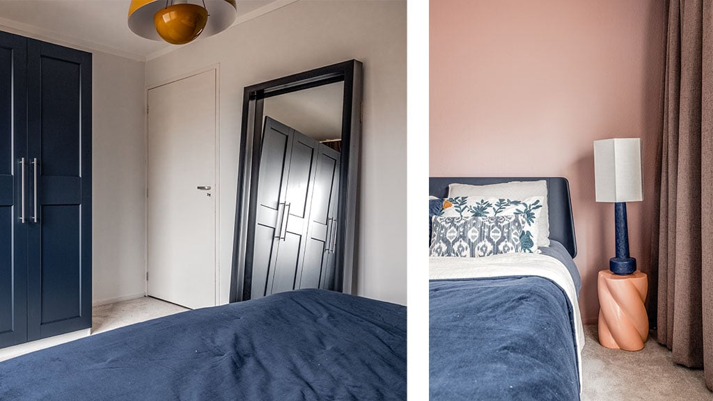 bed | hanglamp | gordijnen | jaloezieën | nachtkastjes | lampenkap | lampvoet | kledingkast en spiegel | beddengoed | sierkussens