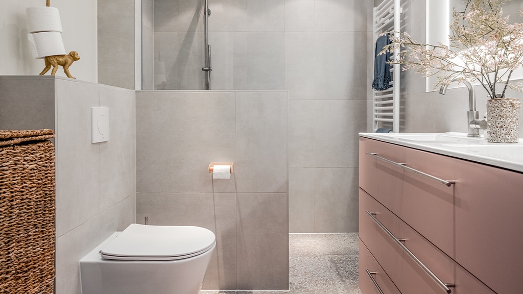 Ook de badkamer is in de basis rustig, maar met een speelse touch. Zo heeft het badkamermeubel een zachte, lichtroze tint met strakke RVS greepjes. Ook de douche en de kraan is van RVS, zodat het één mooi geheel is. Daarnaast is de badkamer na de totale make-over ook veel ruimer opgezet, mede door de inloopdouche – die voor de helft doorzichtig is – en het weglaten van het bad. Dit laatste was immers geen vereiste voor de bewoners en op deze manier komt de badkamer veel meer tot z'n recht.