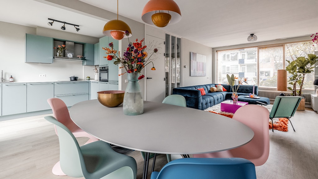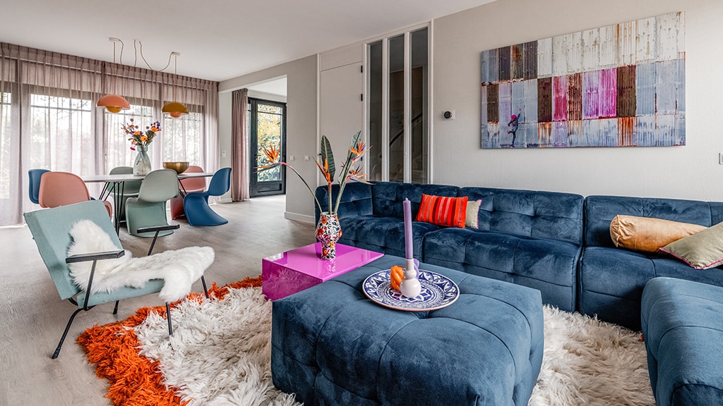 De basis van de woonkamer is lichtgrijs mét opvallende kleuren. De elementenbank is in een diepblauwe kleur en de kasten zijn dezelfde kleur als de muren. Het geheel komt mooi samen met de open keuken en de kleuren van de stoelen aan de eettafel.