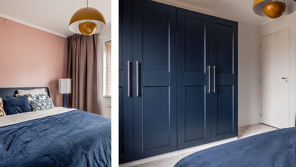 Op de eerste bovenverdieping zijn drie slaapkamers gemaakt en nog een werkkamer. De slaapkamer voor Gijs en Sophie is rustig ingedeeld met donkerblauwe kleuren én natuurlijk ook een pastelroze wand en een set speelse bijzettafeltjes aan beide zijden van het bed.