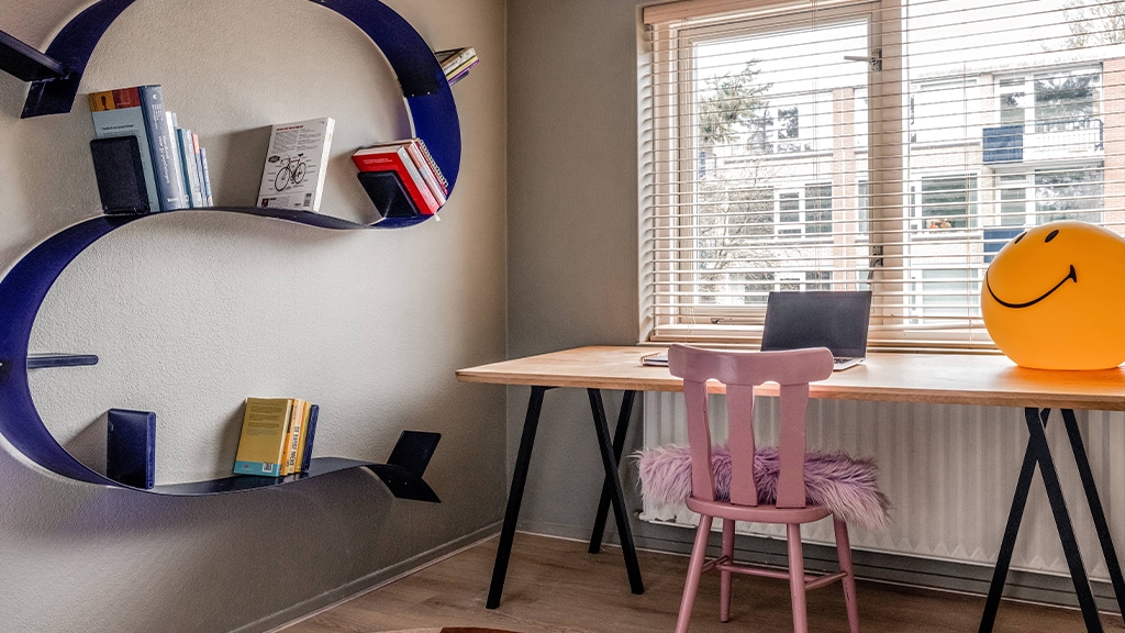 In de werkkamer kunnen de meiden in de toekomst leren, maar ook Gijs en Sophie kunnen hier werken. Deze kamer straalt ook rust uit en heeft een speelse boekenplank.