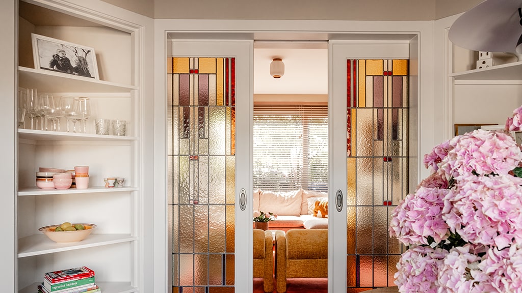 De authentieke details in de woning zijn gebleven: de inbouwkasten, glas-in-lood deuren en de marmeren ombouw van de open haard. In de woonkamer is gekozen voor een lichte driezitsbank met aan de rechterkant een verlengstuk. De bank wordt gecombineerd met twee unieke robuuste stoelen in een warme goudgele kleur. Dit zorgt voor een knus en gezellig geheel.
