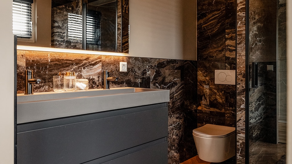 In de badkamer trekt Roos de hotelchique sfeer door. Ze kiest voor een Hongaarse punt op de vloer en tegels met marmerlook op de wand. Ook zit er een bubbelbad in, net een echt hotel!