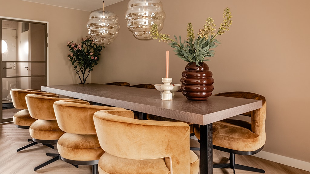 De moodboards van dit stel kwamen sterk met elkaar overeen: ze willen graag een hotelchique sfeer in huis. Roos gaat dit doorvoeren maar wel met een speelse twist ‘we gaan voor goud, maar niet fout’. De woonkamer krijgt een heerlijke ruime hoekbank met ronde vormen en een echte cinewall. Er komt een fijne eetkeuken met een grote eettafel waar ze met al hun familie en vrienden lekker kunnen tafelen. Er komt een nieuwe keuken met donkere frontjes en een donker natuurstenenlook blad. De grote kastenwand zorgt voor optimale opbergruimte. Ook de stalen schuifdeuren stralen de hotelchique sfeer op en top uit. Ze zorgen voor een mooie scheiding tussen de benedenverdieping en de trapopgang naar boven.