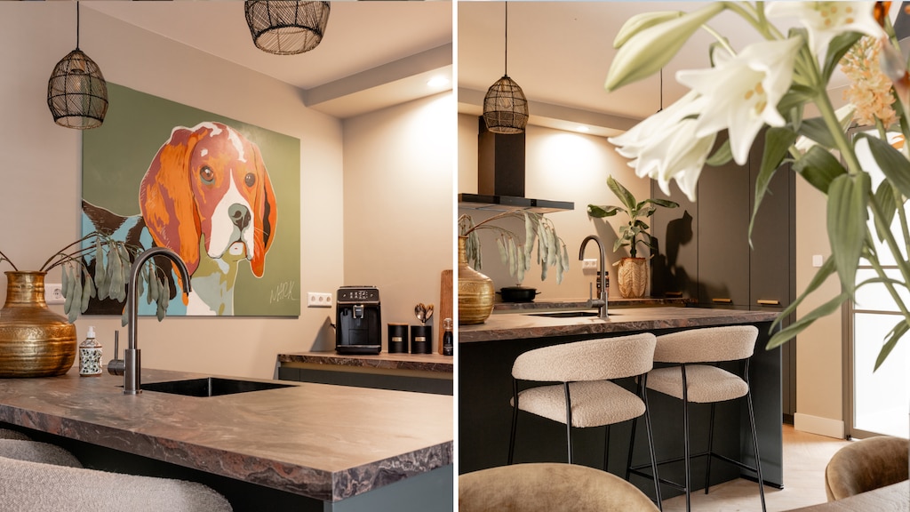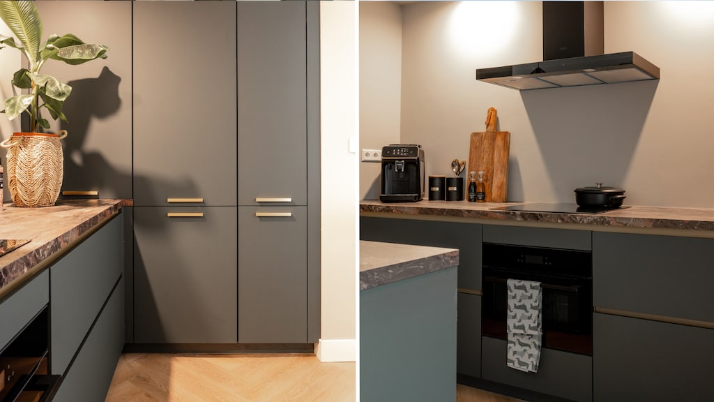 Roos ziet op de moodboards van Matthijs en Koen het chique hotelgevoel sterk naar voren komen: in het materiaal, de kleuren en de meubels. Allebei houden ze van een donkere keuken met een natuurstenen blad. Roos besluit voor mineraalgroene, matte frontjes te gaan en een stenen marmerlook blad. Er komt een hoge wand aan de zijkant van de keuken met alle inbouwapparatuur en aan de voorkant een half kookeiland, oftewel een schier kookeiland. Hier kun je heerlijk koken, borrelen en barhangen op de zachte barkrukken.