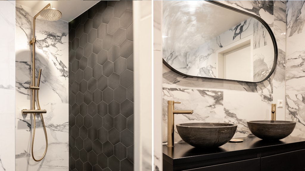 Met een dubbele zwarte wasbak met opzetkom én een dubbele inloopdouche – of hoe Koen het noemt: de wasstraat – is dit een totaal vernieuwde en prachtige badkamer geworden waar Koen en Matthijs sprakeloos van zijn.
